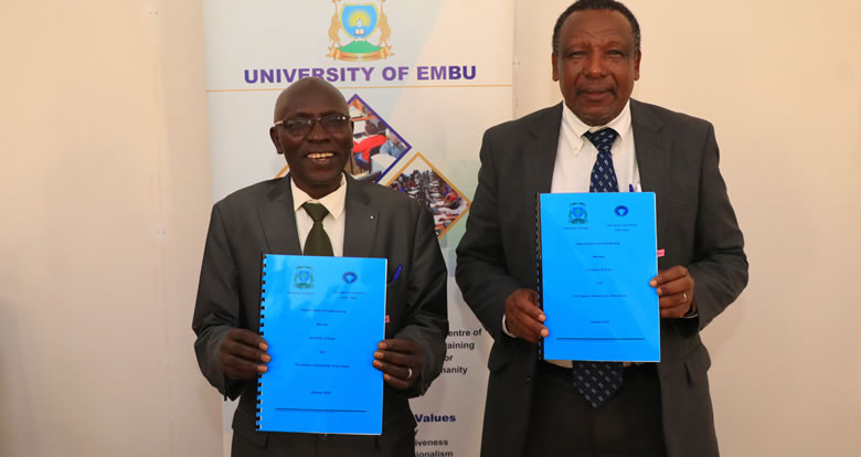 The VC, Prof. Daniel Mugendi on Wednesday 8th October, 2025 received a team of 6 officials from Gideons International, Embu Camp for an MoU Signing Ceremony in the Senate Boardroom. The Team was ushered in by the University Chaplain, Rev, Dr. Mary Nkari. They were led by the outgoing President, Mr. Francis Mulela Kasungo and the Zonal Coordinator, Eng. Joel Ngugi.
