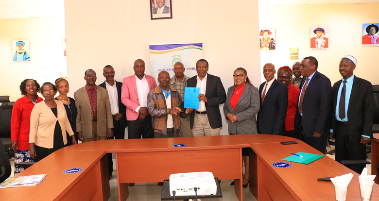 A delegation of eight committee members from the Njukiri-Nthambo Community-Based Organization (NNCI-CBO) visited the University of Embu on Wednesday, 2nd July 2025, for the signing of a reviewed Memorandum of Understanding (MoU). The team, led by Vice-Chairman Mr. Josephat Kathuraku, was received by the Vice-Chancellor, Prof. Daniel Mugendi, on behalf of the University Management.